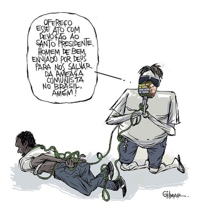 Machado: Nesse momento de polarização política teve muito ataque. Eu tinha um público muito variado na rede social, estava publicando coisas mais lights, fazia muita tirinha de humor comportamental. Aí veio o governo atual, na campanha eu já comecei a fazer charges críticas e políticas, como eu sempre fiz na vida, contra Lula, FHC e vários governos. Sempre tive essa liberdade de fazer, apesar de conhecer Lula de ter me formado e ter convívio com a família dele, por uma época, nunca deixei de criticar. Eu acho que o trabalho profissional vem em primeiro momento e eu gosto de ter essa liberdade profissional para criticar qualquer um que esteja no poder. Quando começou a campanha de 2018, eu comecei a fazer crítica do governo atual e aí comecei a receber um monte de xingamento. Eu não entendi e fiquei meio surpreso, tinha coisas bem esquisitas, do tipo “você não pode fazer isso, respeita o capitão”. Eu achava muito surreal e foi isso que deu mais gás para continuar fazendo charges mais ferrenhas contra o governo e sobre todas as aberrações deploráveis da linha política, que não tem nenhuma proposta, por isso causa essa confusão, enfim é uma coisa patética na minha opinião. Ao longo do tempo foi rolando esse tipo de crítica, de xingamentos. No começo ficava meio assustado, inclusive porque uma das pessoas que me criticava e ameaçava, é um cara que ficava do lado do Bolsonaro do PSL, o vice-presidente do PSL na época, deputado federal do Nordeste. Acho que até hoje ele me segue e fica acompanhando o que eu faço. Esse eu tinha medo porque era complicado. Depois eu fui assimilando e vendo os perfis das pessoas que ameaçavam e xingavam a minha mãe, aquelas coisas para tentar reprimir. Até hoje tem pessoas que ficam seguindo, mas teve um filtro ao longo do tempo. Eu percebia que vários deles eram conservadores e aquelas “feras de teclado”. Porém, hoje a gente não sabe, é imprevisível. Teve gente que saiu do país por causa de ameaças. Coisas já me deixaram deprimido, querendo parar de fazer charge, mas hoje, por enquanto, vou assimilando e entendendo. Se acontece alguma coisa mais séria, mais complicada, aí eu já não sei como é que vai ser.